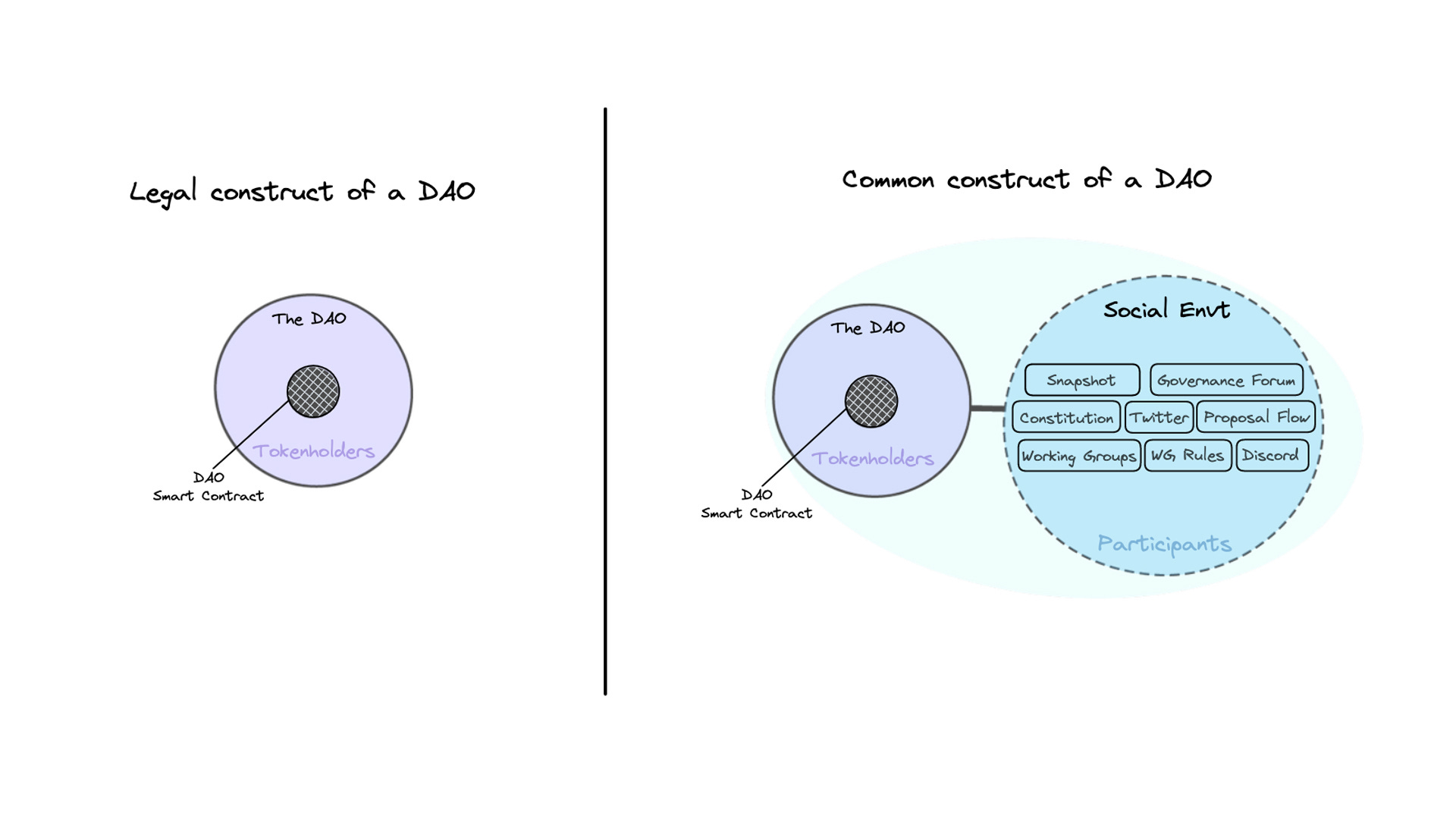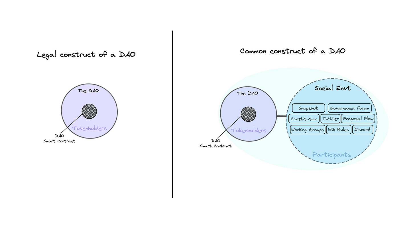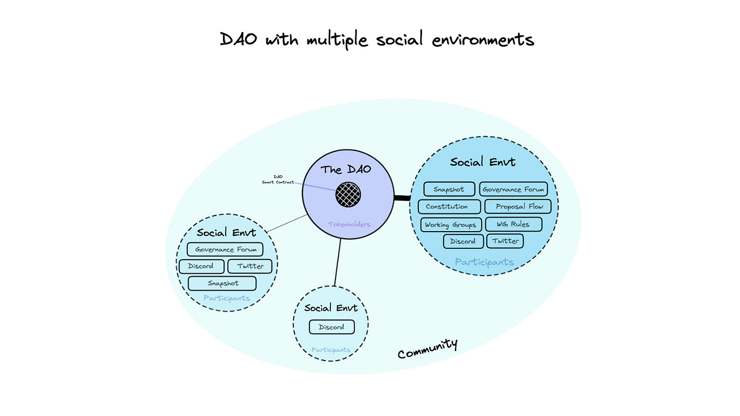 A single social environment within a DAO might consist of a governance forum, Snapshot space, Discord, Twitter, as well as governance processes and documentation. It is now common to think of a DAO as the collective group of tokenholders combined with a social environment where DAO participants most frequently interact.