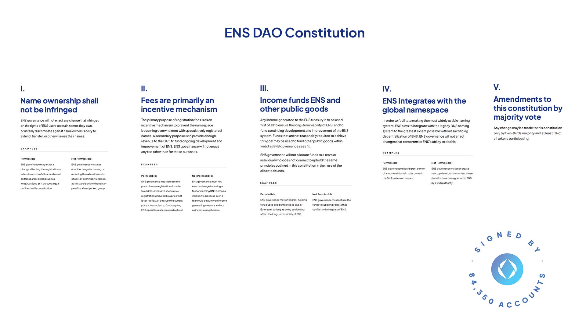 While the constitution itself is extremely important for the ENS DAO, it is not a legal document, but rather a social document that sets out the purpose and mission of the DAO and guides DAO tokenholders and participants. All DAOs should have a constitution or a clear mission or purpose statement approved by tokeholders.